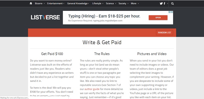 Listverse. You have to write the least 10 lists, if it is published on this website, you get $ 100 for each article. But it is important to have your PayPal account to make money from here. Otherwise, you cannot take money from here.